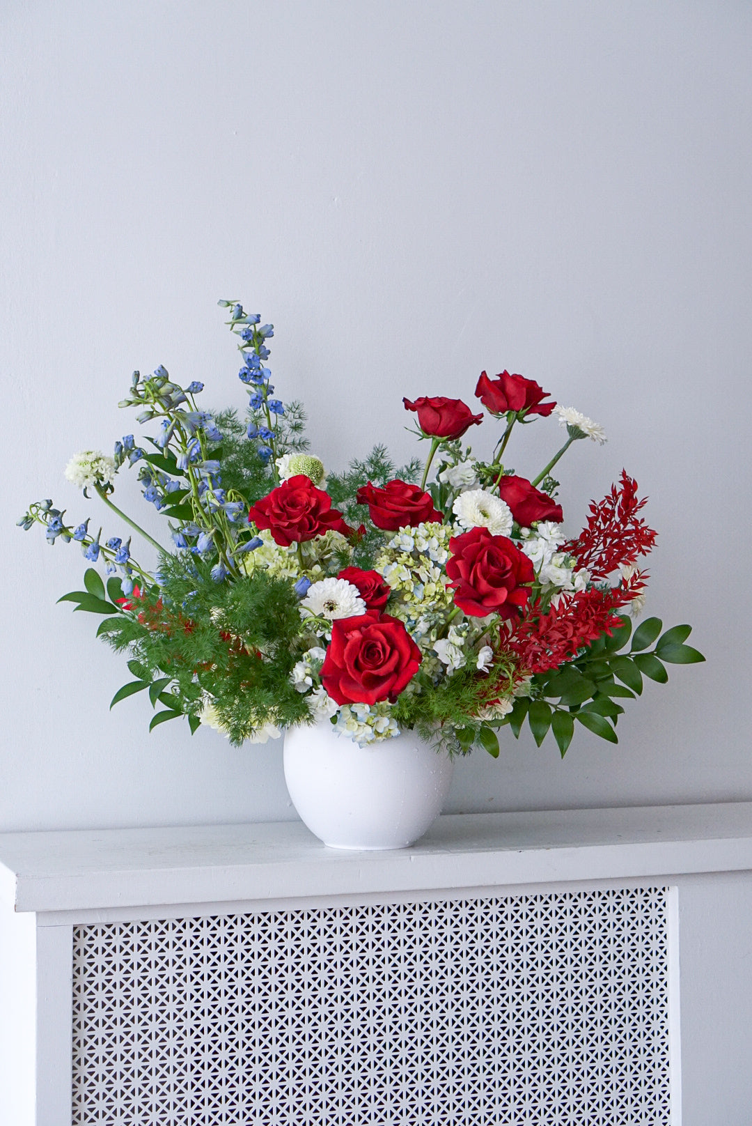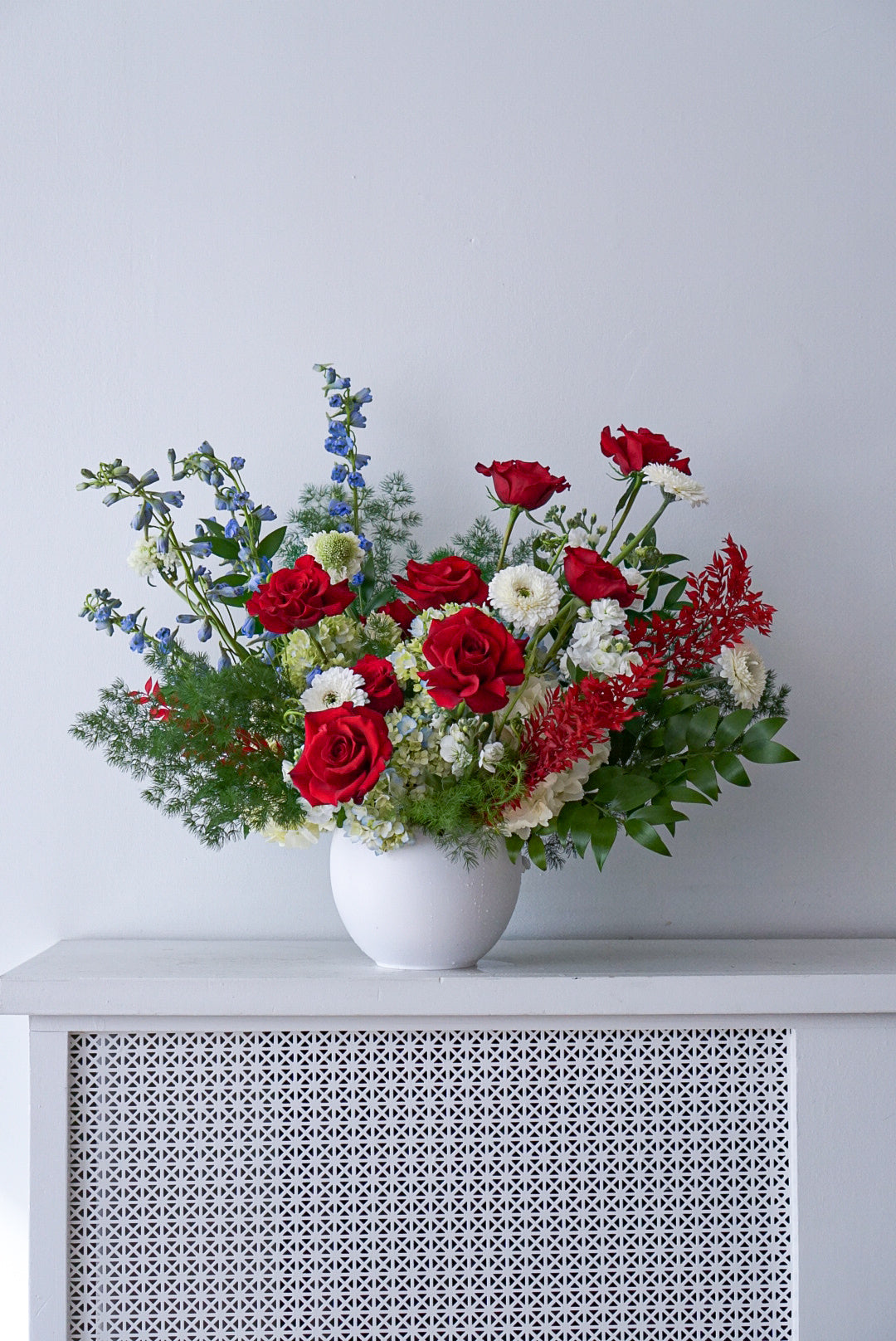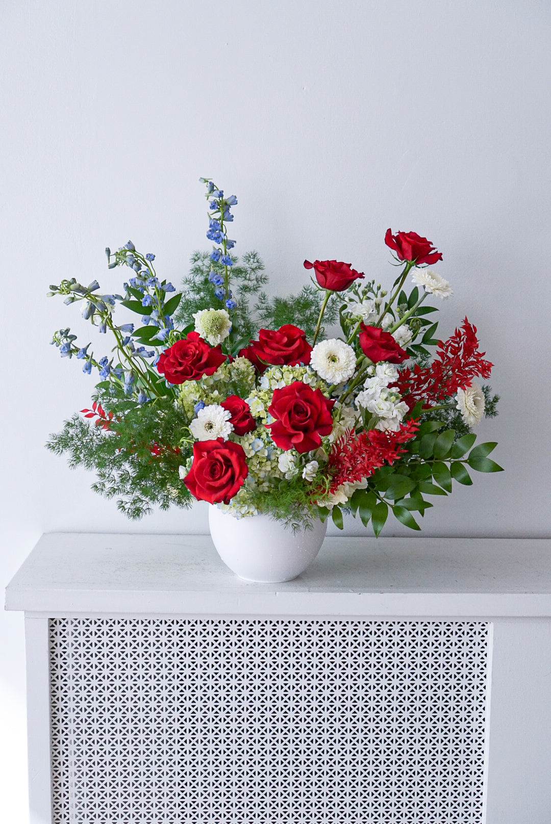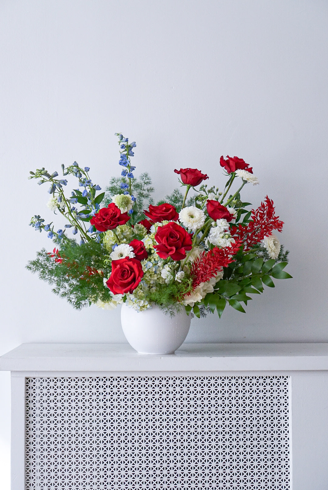 Scarlet & Sapphire is a stunning arrangement featuring blue hydrangeas, blue delphinium, and bold red roses. The combination of these vibrant flowers creates a striking contrast, making it the perfect statement piece for any occasion. Delicate white accents add a touch of elegance to this bouquet. Bring a pop of color to your space with Scarlet & Sapphire.