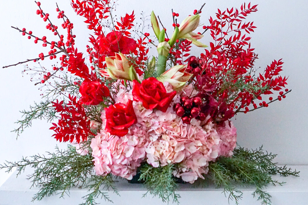 A stunning holiday arrangement blending deep red amaryllis, soft pink hydrangeas, festive ilex berries, Italian ruscus, and red ornaments. Designed to bring warmth and luxury to your holiday season.